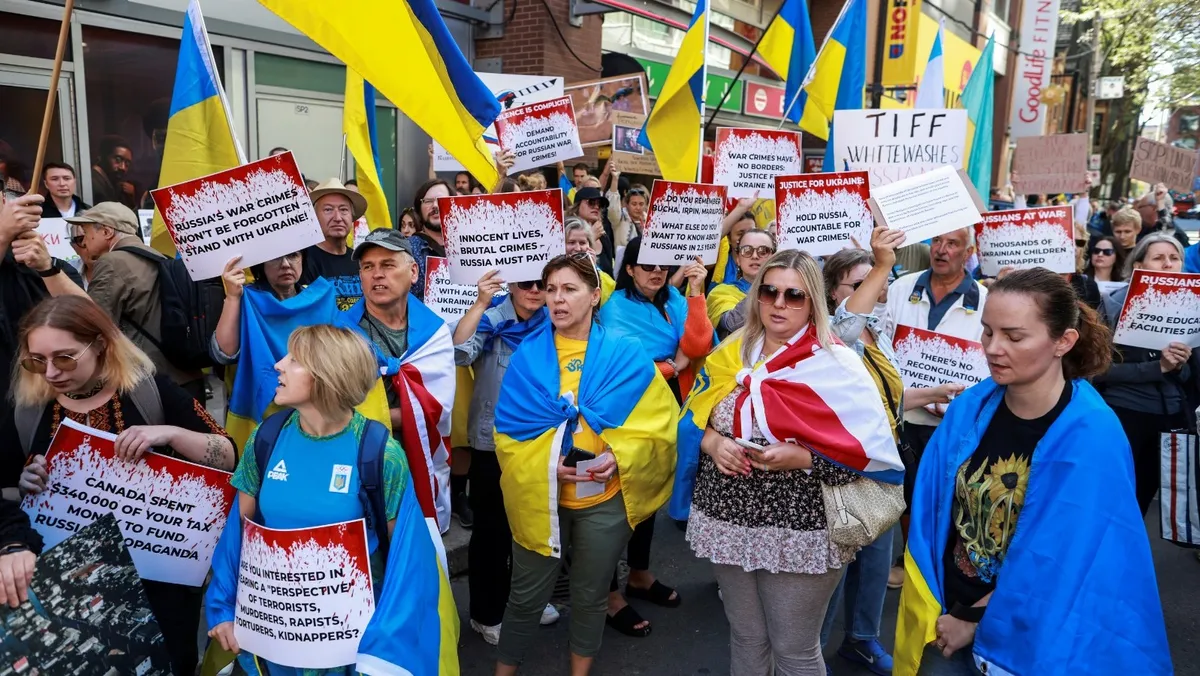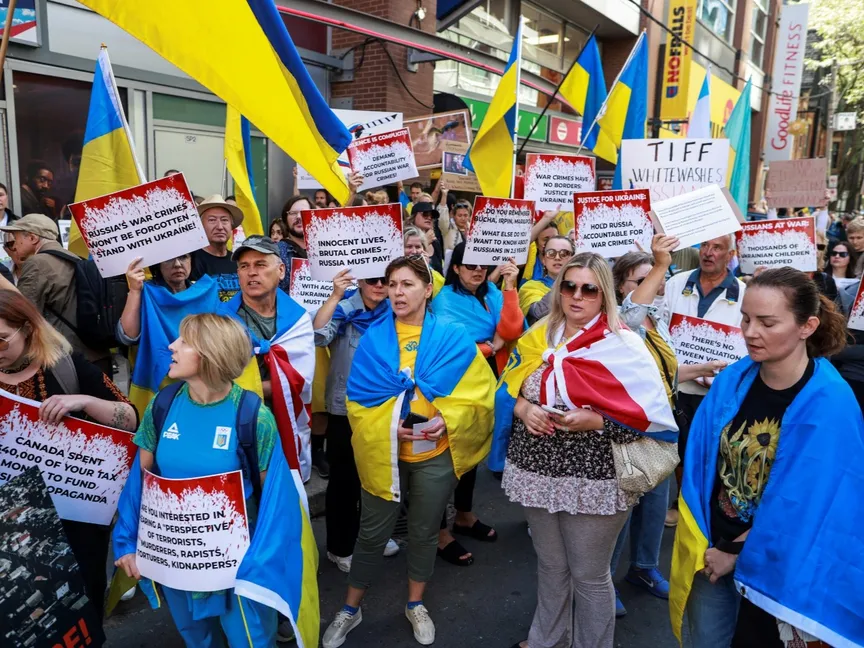 واصل كنديون من أصل أوكراني احتجاجاتهم على هامش مهرجان تورونتو السينمائي الدولي، حتى بعد قرار المنظمين وقف عرض فيلم وثائقي عن الجنود الروس في أوكرانيا، والذي تعرض لانتقادات باعتباره "دعائي".