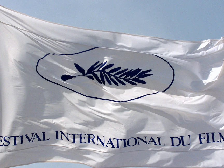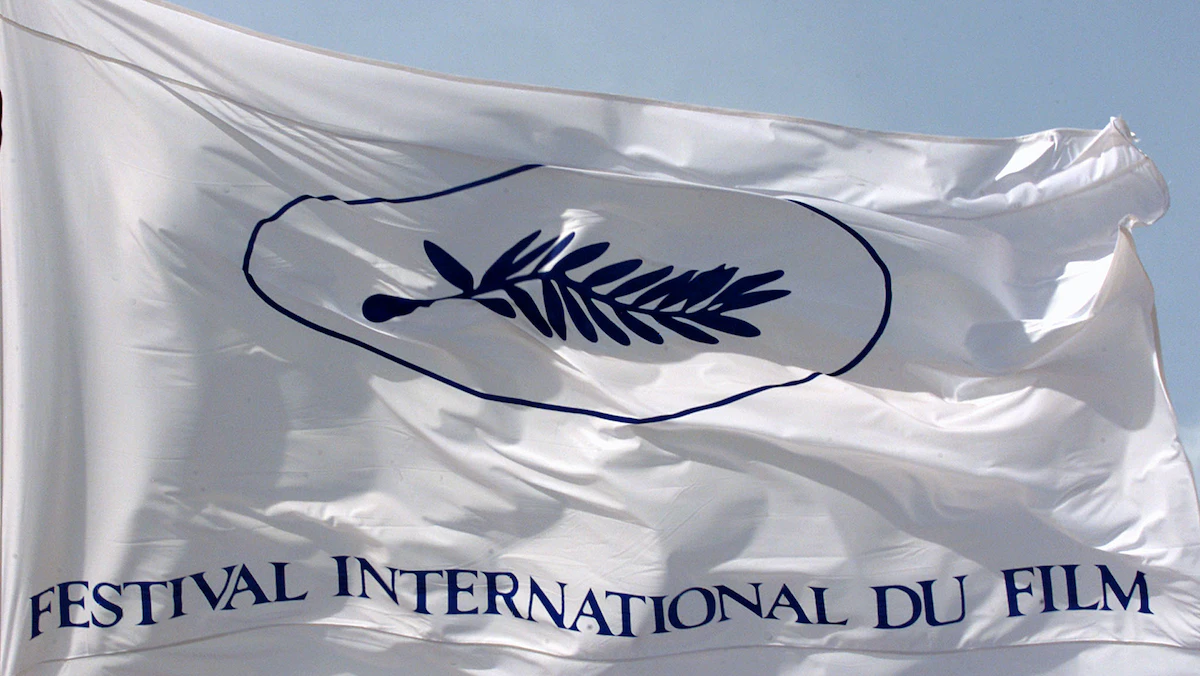 شعار مهرجان كان السينمائي "السعفة الذهبية" على أحد الأعلام  - X00245