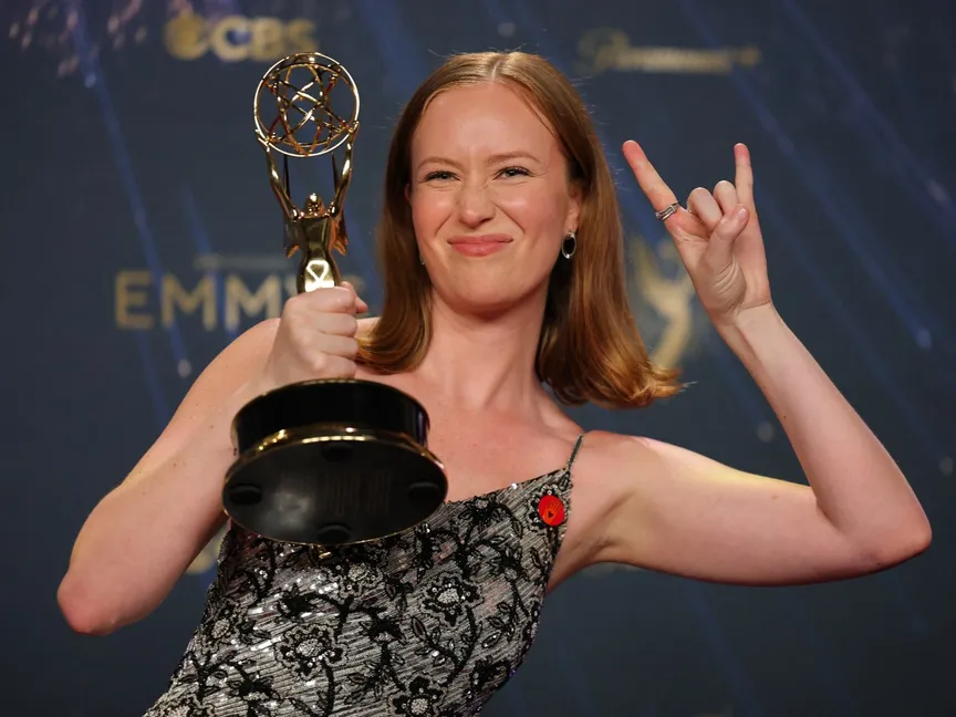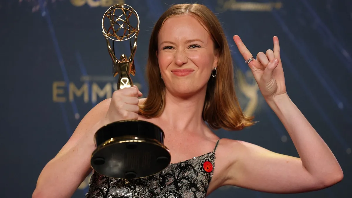 هانا أينبيندر نجمة مسلسل Hacks بعد فوزها بجائزة إيمي كأفضل ممثلة مساعدة خلال الحفل الذي أقيم  في لوس أنجلوس. 15 سبتمبر 2025 - Reuters