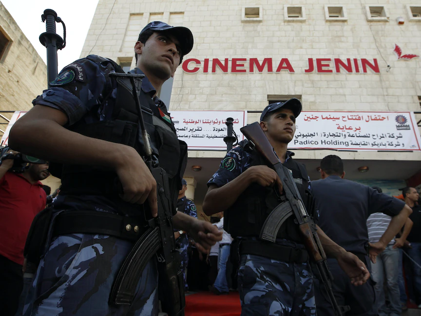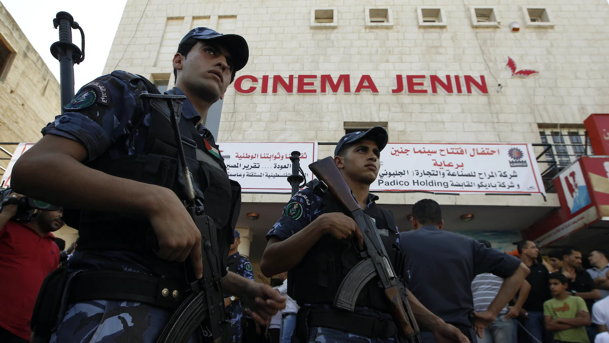 الشرطة الفلسطينية تقف خارج سينما جنين في مدينة جنين بالضفة الغربية - 5 أغسطس 2010 - REUTERS