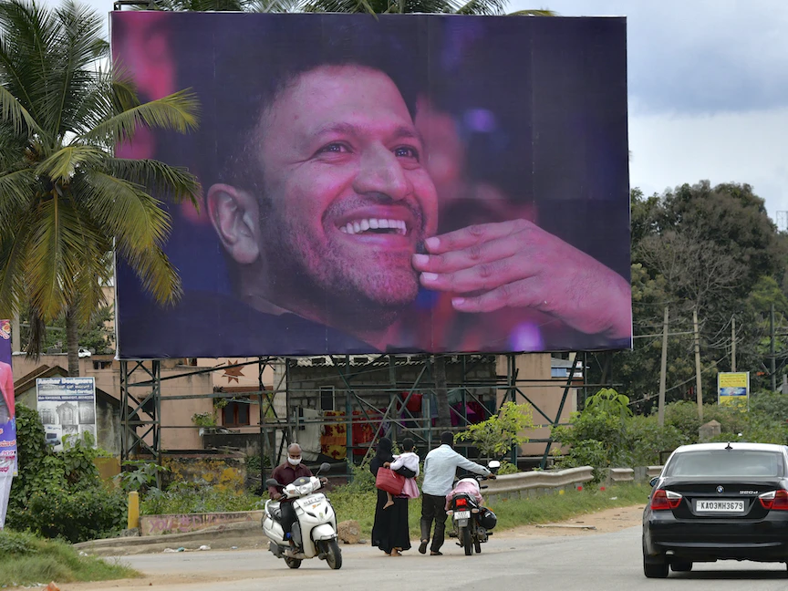 ملصق للنجم السينمائي الهندي الراحل بونيث راجكومار، تم نشره للإشادة بوفاته الأخيرة إثر أزمة قلبية، في بنغالور، الهند. 1 نوفمبر 2021 - AFP