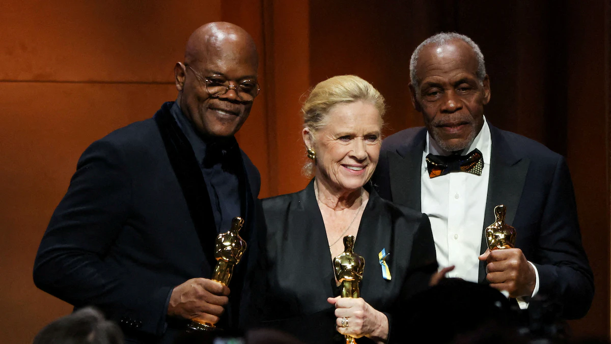 من اليسار الممثلون صامويل جاكسون وليف أولمان وداني جلوفر، بعد تسلمهم جوائز الأوسكار الفخرية خلال حفل توزيع جوائز المحافظين الـ12 في قاعة راي دولبي، لوس أنجلوس، كاليفورنيا، الولايات المتحدة - 25 مارس 2022. - REUTERS
