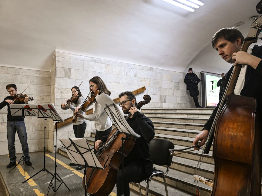 وعزفت الفرقة المكونة من 5 موسيقيين، على آلات الكمان والتشيلو والباص أمام عشرات الأشخاص لمدة نصف ساعة في إحدى محطات المترو الرئيسية في ثاني مدن أوكرانيا، قرب الحدود الروسية.
