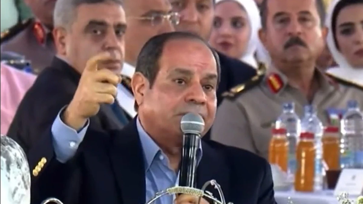 الرئيس المصري عبد الفتاح السيسي يشير بيده إلى تهديدات القيادي في جماعة الإخوان خيرت الشاطر خلال احتفالية عيد الفطر - القاهرة - 2 مايو 2022