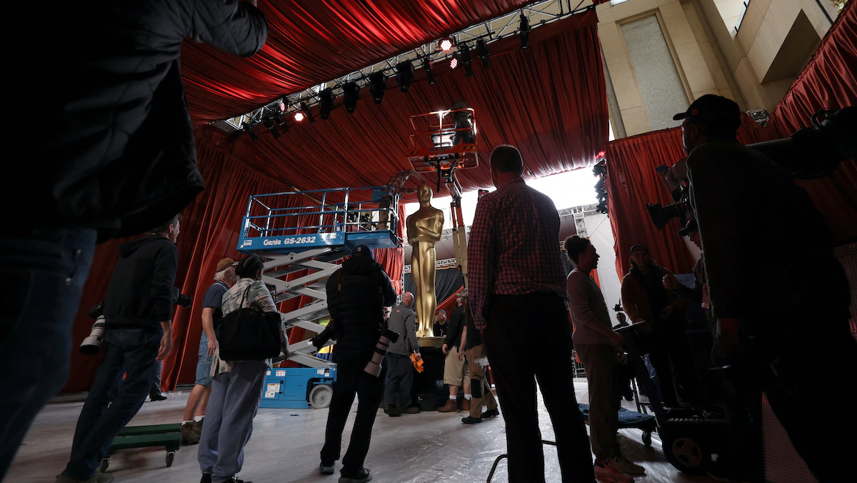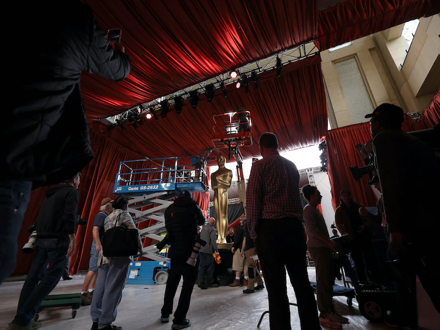 رفع تمثال أوسكار في مكانه في مدخل مسرح دولبي ضمن استعدادات حفل توزيع الجوائز الـ95 في لوس أنجلوس، كاليفورنيا،  11 مارس 2023. - REUTERS