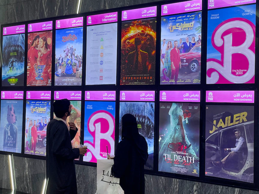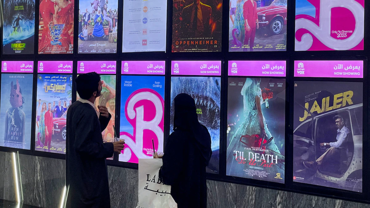 جمهور السينما أمام لوحة الإعلانات خلال العرض الأول لفيلم Barbie في صالات السعودية- الرياض، 10 أغسطس 2023 - REUTERS