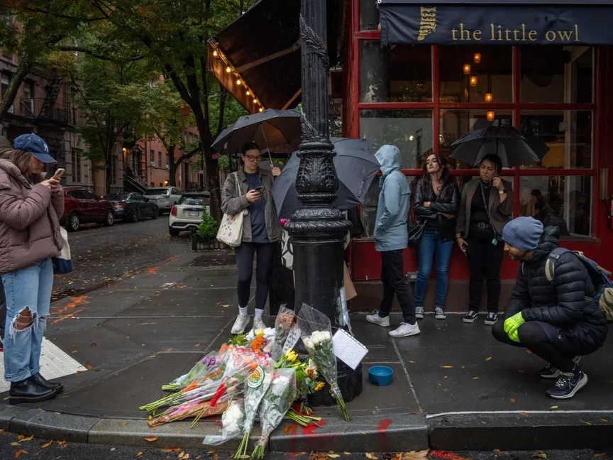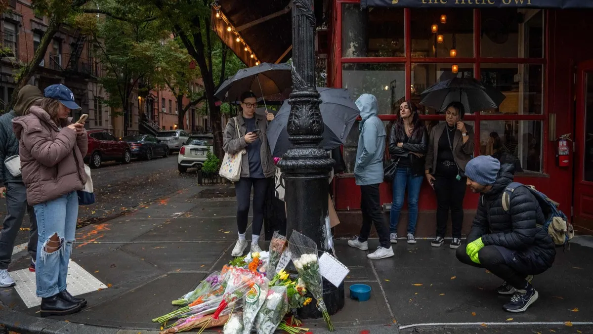 محبو مسلسل Friends يوجهون التحية بالزهور للممثل الراحل ماثيو بيري، خارج المبنى السكني الشهير الذي ظهر في المسلسل الشهير في نيويورك، 29 أكتوبر 2023. - AFP