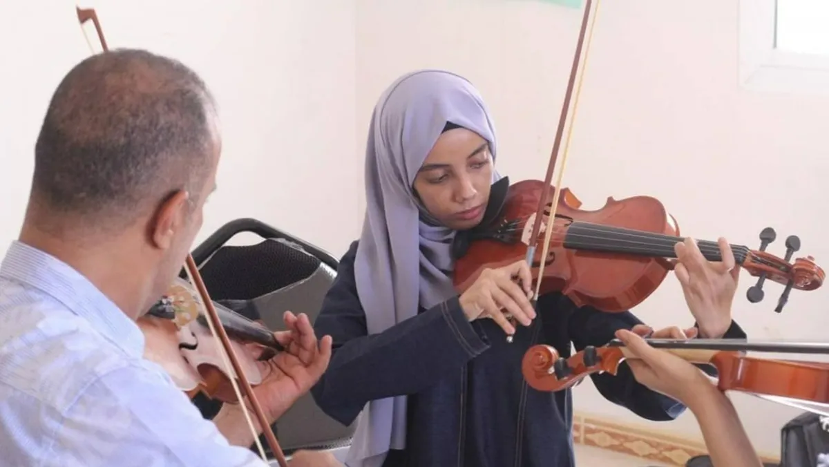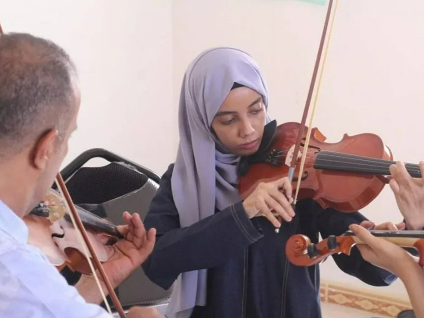 فتاة يمنية تعزف على آلة الكمان ضمن فرقة نسائية يمينة - صورة متداولة