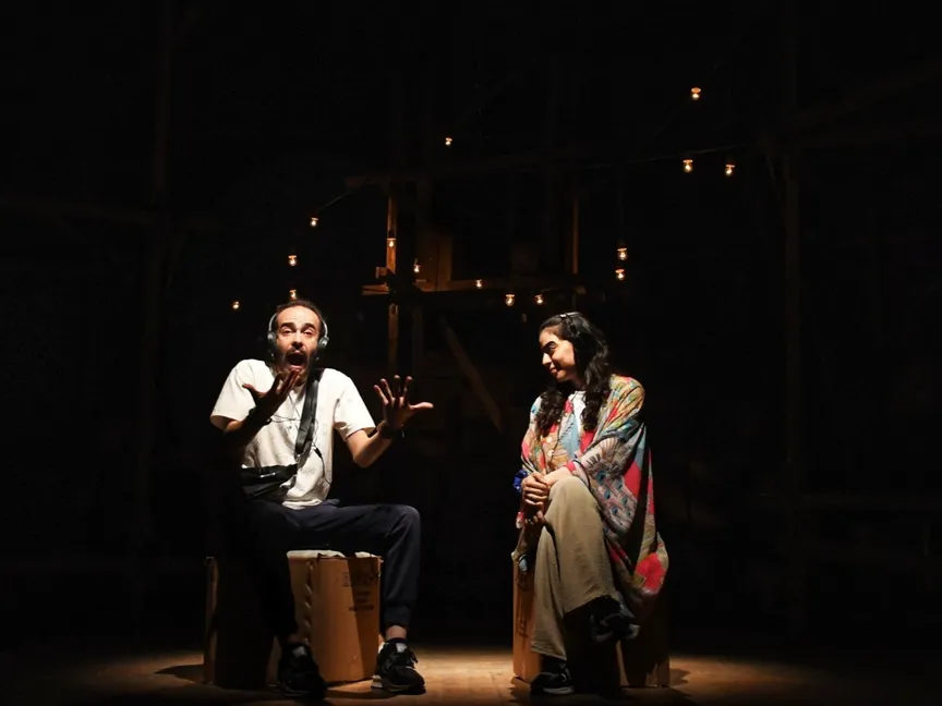 ويظهر داخل المسرح ممثلو العرض وهم يؤدّون أدوار الباعة ويُمسكون بمكبّرات الصوت الصاخبة؛ كما ينقل النصّ معاناتهم في ظلّ صعوبات الوضع الاقتصادي.