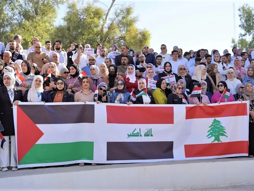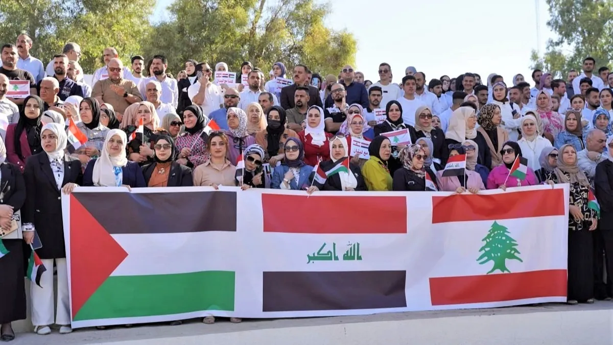 كما نظّمت الجامعات العراقية، الأربعاء، وقفات احتجاجية داعمة للشعبين الفلسطيني واللبناني، ويهدّد المنطقة وشعوبها، بحسب وكالة الأنباء العراقية.