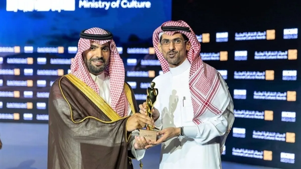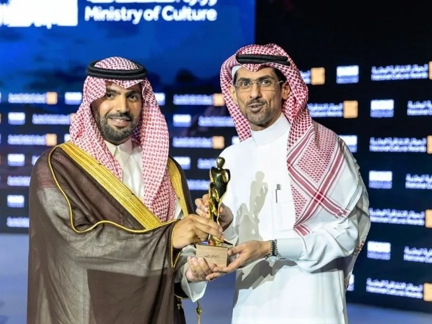 أسامة المسلم مع وزير الثقافة الأمير بدر بن فرحان أثناء تسلمه جائزة الثقافة الوطنية في الأدب (2024) - @OsamahAlmuslim