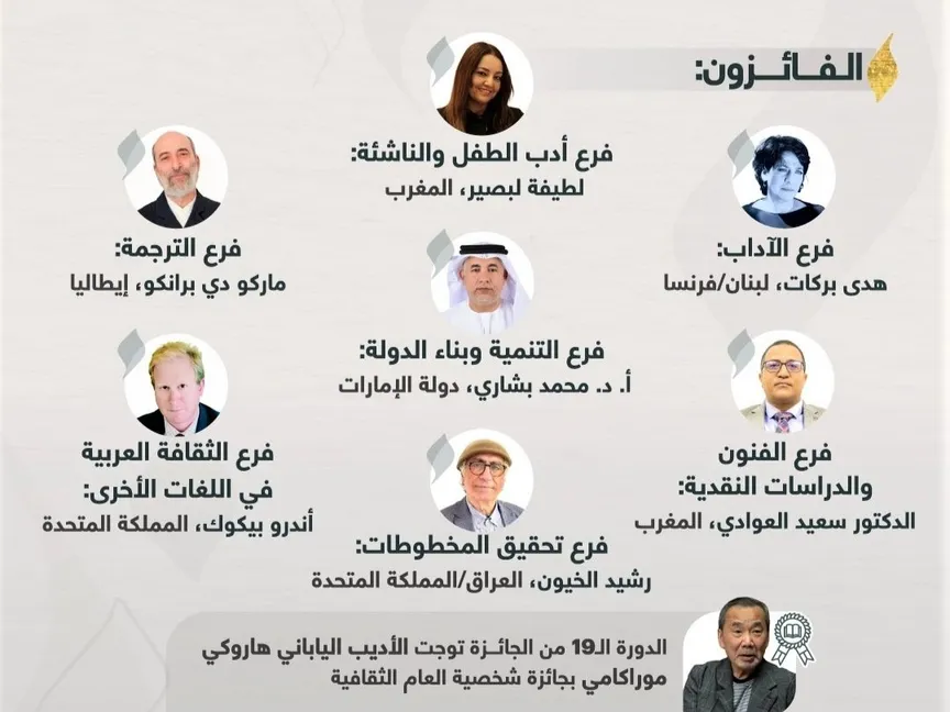 أعلنت جائزة الشيخ زايد للكتاب أسماء الفائزين بدورتها الـ19، كما أعلنت عن الشخصية الثقافية للعام 2025، وهو الكاتب الياباني العالمي هاروكي موراكامي.