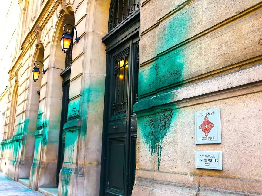 تعرّضت العديد من المواقع اليهودية الثقافية والتاريخية في باريس، لهجوم بالطلاء الأخضر، بما في ذلك متحف الهولوكوست، والنصب التذكاري للمحرقة، وكنيس تورني، وكنيس أغوداس هاكهيلوس، وجميعها في الحي اليهودي بالمدينة، فضلاً عن كنيس ثالث في منطقة أخرى.