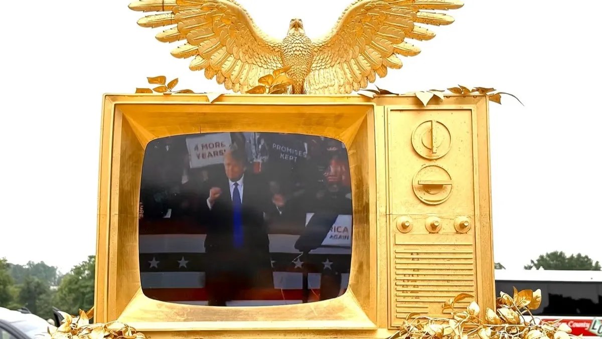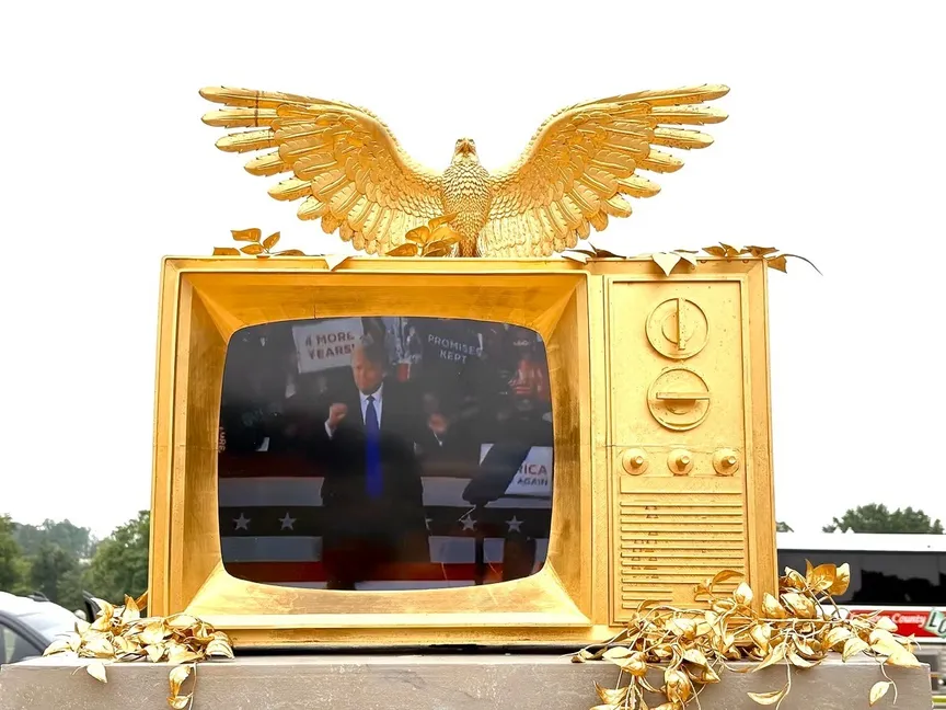 العمل الفني هو عبارة عن جهاز تلفزيون قديم الطراز يعلوه نسر ذهبي، مجهول المصدر، ولم يتم التعرّف إلى هوية الفنان الذي صمّمه، بحسب صحيفة "واشنطن بوست".