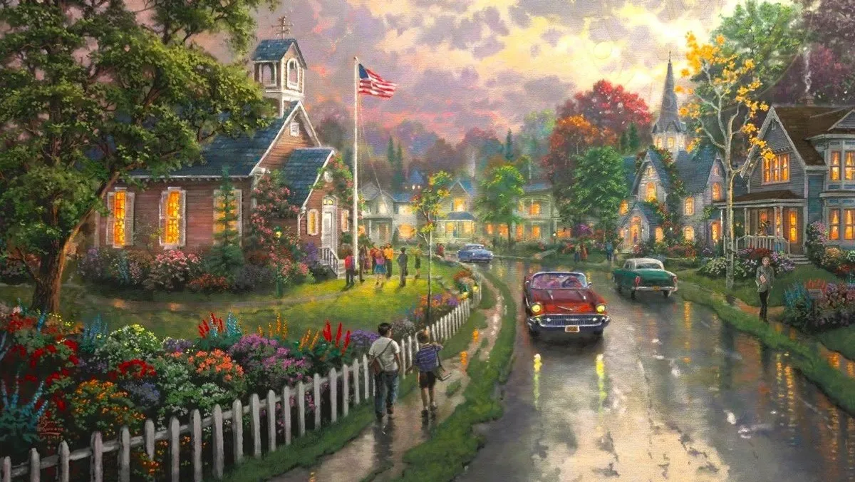 اللوحة أثارت جدلاً على مواقع التواصل الاجتماعي، وهي تجسّد مشهداً مثالياً يعود إلى منتصف القرن العشرين، حيث تسير سيارات قديمة في شوارع بلدة صغيرة، مروراً بمدرسة قديمة الطراز، يرفرف العلم الأميركي في ساحتها.