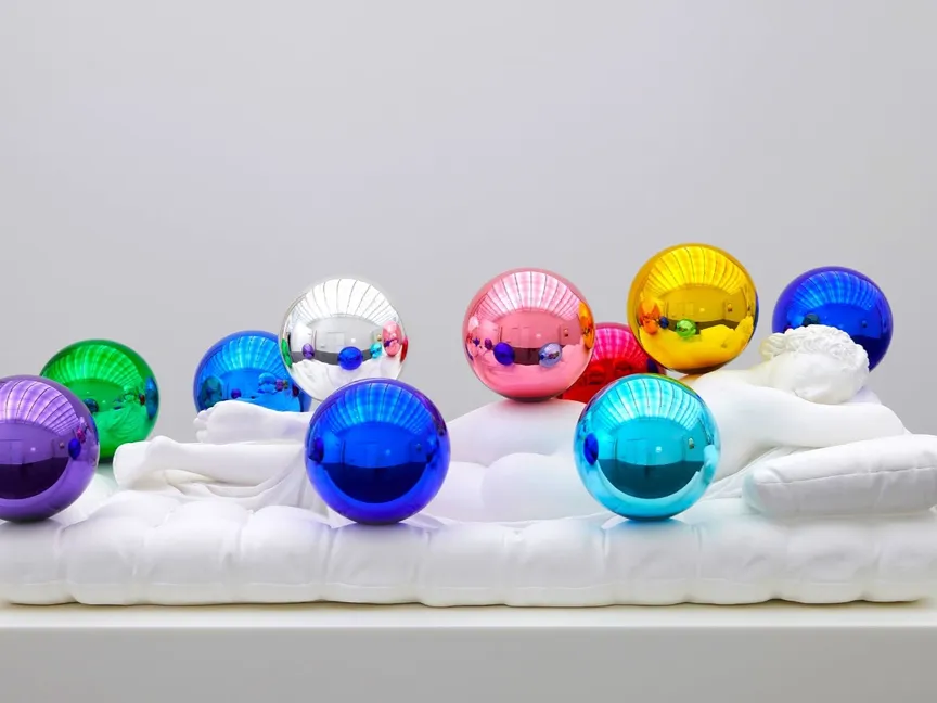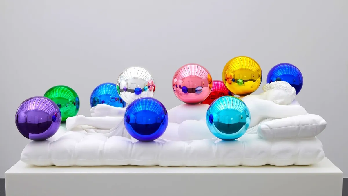 عمل للفنان الأميركي جيف كونز استنسخه من تمثال روماني قديم من الرخام (1620) وأضاف إليه كرات ملوّنة. (يوليو 2025) - jeffkoons.com