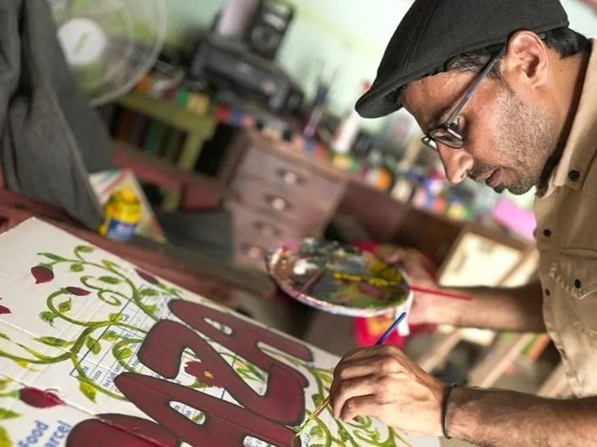 الفنان الفلسطيني أحمد مهنا يرسم على صناديق المساعدات الإنسانية في غزة .(2025) - news.un.org