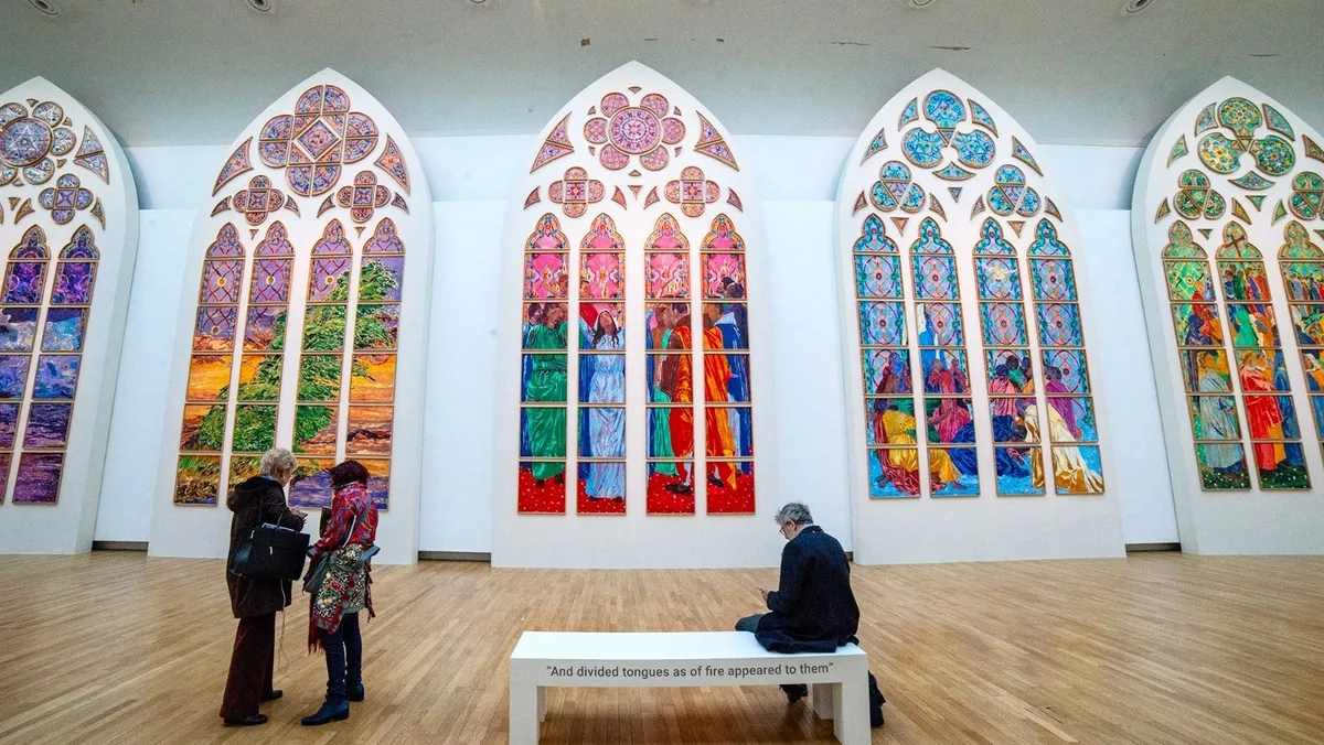 وقالت عن درجات الأحمر والأخضر والأزرق النابضة بالحياة، التي تحاكي ألوان الفن الديني التاريخي: "ستُستوحى ألوان الزجاج مباشرة من لوحاتي".