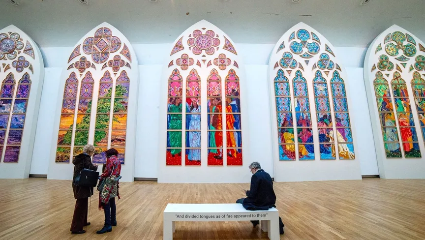 يضم المعرض نماذج مصغّرة بالحجم الطبيعي مرسومة بالحبر على الورق، لنوافذ الكاتدرائية الجديدة. وتتبع التصاميم فكرة أساسية، وهي قصة عيد العنصرة عندما حلّ الروح القدس على جمع غفير، وملأ كل نفس.