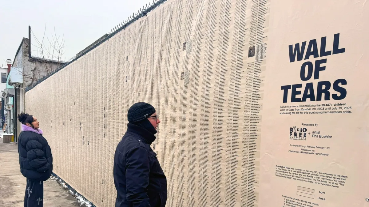في قلب مدينة نيويورك، يمتدّ "جدار الدموع" على طول شارع بروكلين، حاملاً أسماء 18,457 طفل فلسطيني قتلتهم إسرائيل في قطاع غزة خلال العامين الماضيين، وتحديداً بين 7 أكتوبر 2023 و 19 يوليو 2025.