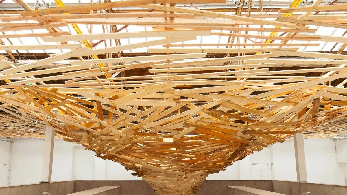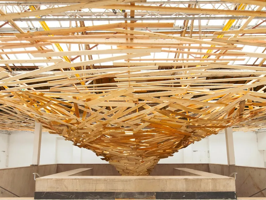 يقدّم الفنان تجربة غامرة تثير تساؤلات حول علاقتنا بالمكان والزمان والطبيعة. توحي الألواح المرتبة بنمط غير منتظم، بحركة حلزونية، وقوة دائرية جاهزة لابتلاع الفضاء. يقف المشاهد في قلب العاصفة الخشبية، وكأن الإعصار يتحول من شرنقة واقية للعصافير إلى انفجار هائل من الطاقة.