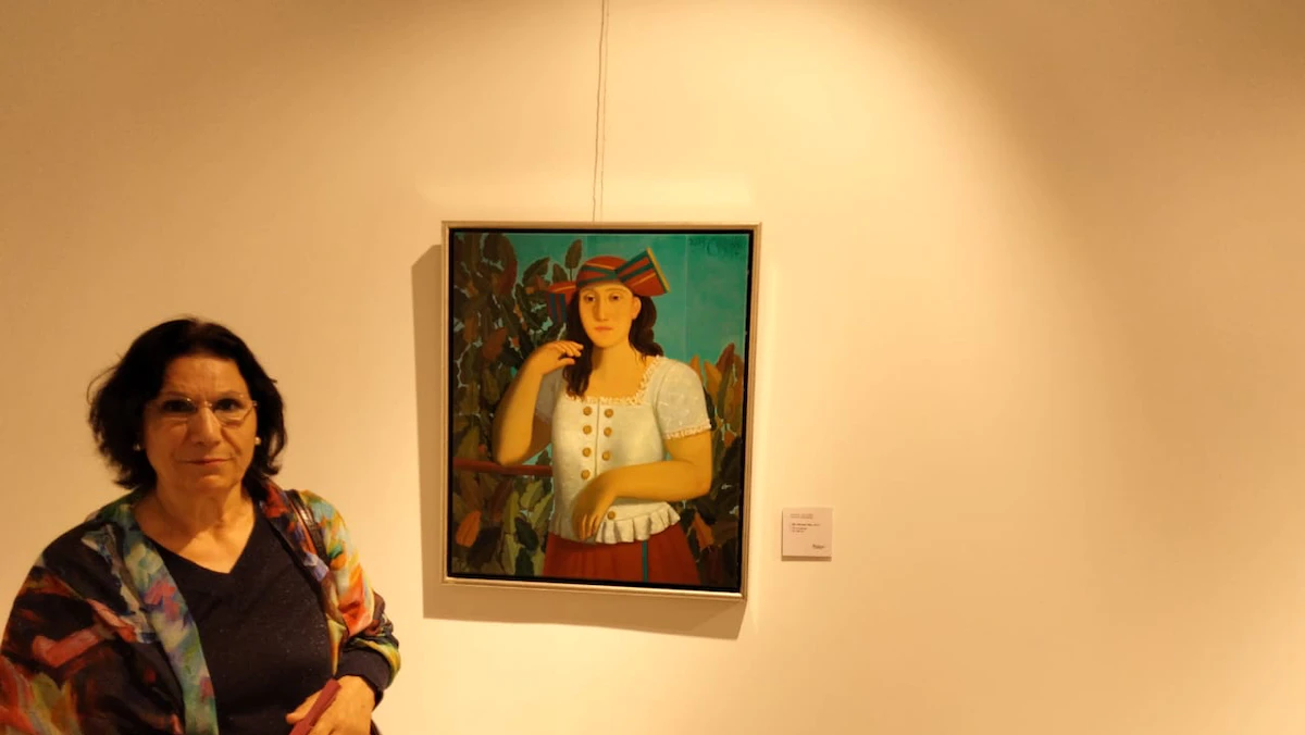 الفنانة العراقية عفيفة لعيبي مع إحدى لوحاتها في معرض محطات الغربة. - الشرق