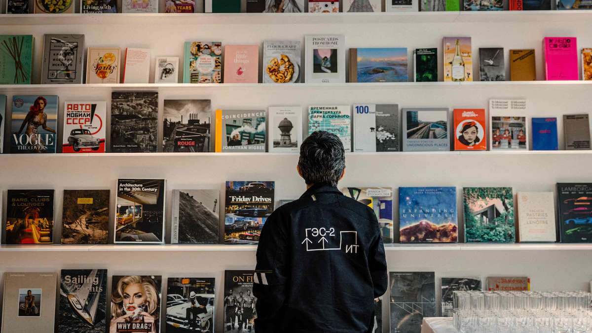 موظف يقف أمام مجموعة من الكتب خلال افتتاح مركز للفنون المعاصرة على ضفاف نهر موسكفا بموسكو 3 ديسمبر 2021 - AFP