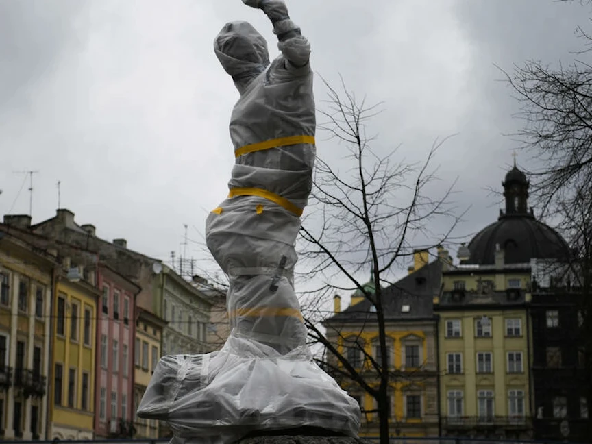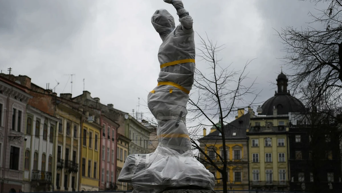 في وسط مدينة لفيف بغرب أوكرانيا، غُلّفت التماثيل المستوحاة من الأساطير الإغريقية والرومانية بأقمشة مشمعة وواقية من الحريق، في محاولة حثيثة لحمايتها من هجوم محتمل، ولصون التراث الثقافي الغني من الحرب المدمرة.