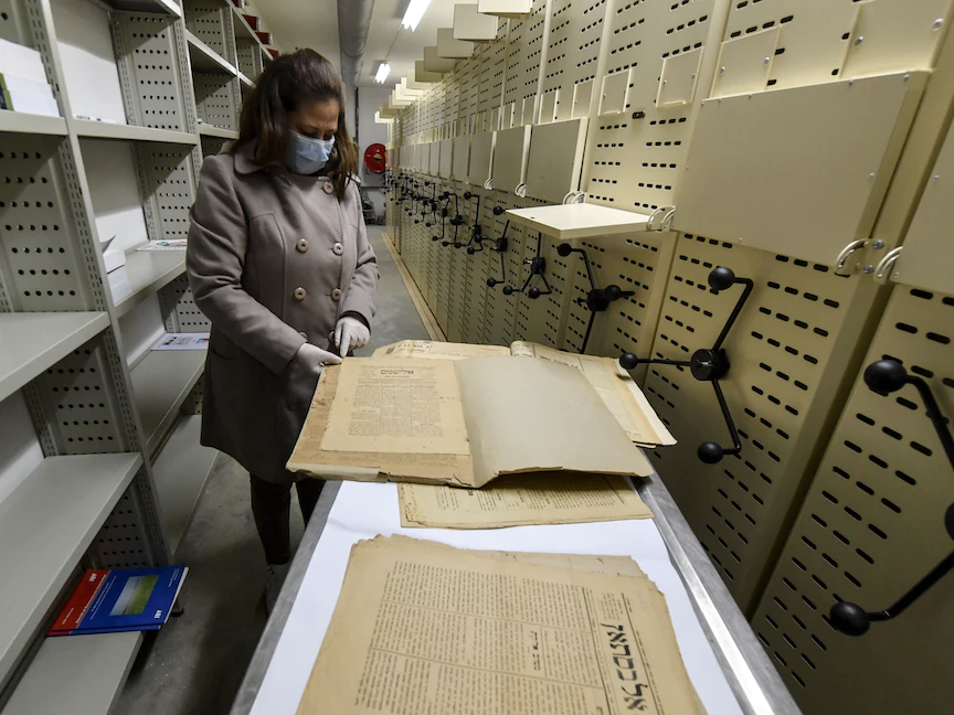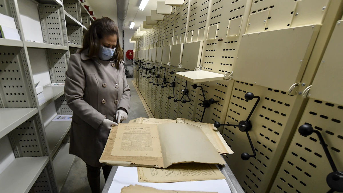 تتنقل حسناء القابسي في الدور السفلي لمبنى المكتبة الوطنية بالعاصمة تونس بين رفوف تحتوي على طبعات صحف ودوريات تعود للقرن التاسع عشر، تجمع نسخاً منها لرقمنتها في حملة تهدف لحفظ هذا التراث الفريد من مراجع ووثائق.