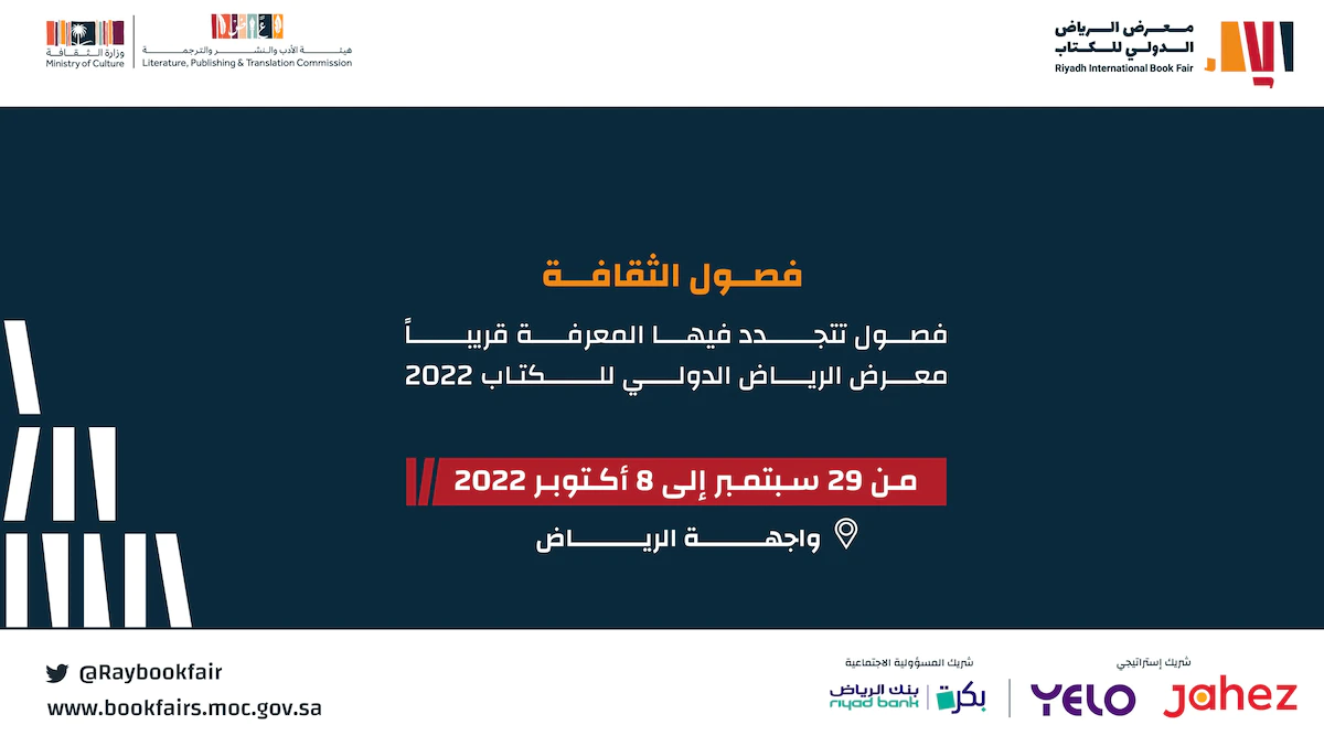 ينطلق معرض الرياض الدولي للكتاب "فصول الثقافة"، الخميس في 29 سبتمبر ويستمرّ حتى 8 أكتوبر 2022، في واجهة الرياض، تحت إشراف هيئة الأدب والنشر والترجمة التابعة لوزارة الثقافة السعودية.
