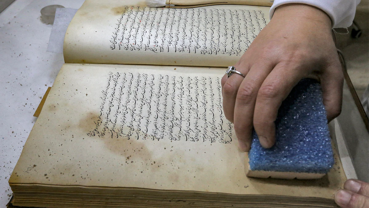في غرفة مجاورة، تستند مرممة عراقية على مكتبها، وبفرشاة صغيرة تزيل بتأنٍ الغبار عن لوحة خطية محدّبة الأطراف، قبل مسحها برفق بممحاة.