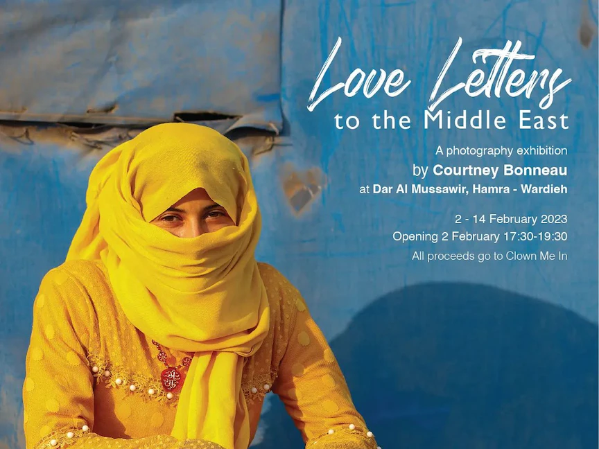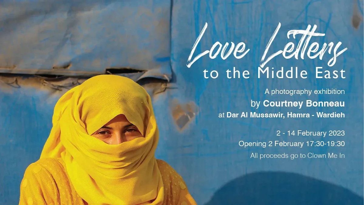 ملصق معرض كورتني بونو "رسائل حب إلى الشرق الأوسط" 2-فبراير 2023 - facebook.com/DarAlMussawirPage