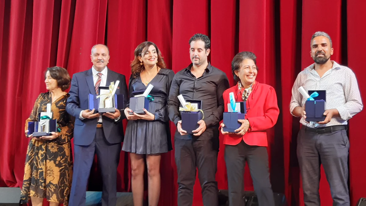 صورة جماعية للفائزين بجوائز "الكومار الذهبي" في تونس. 06 مايو 2023 - AFP