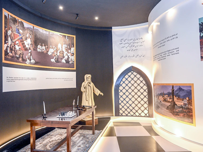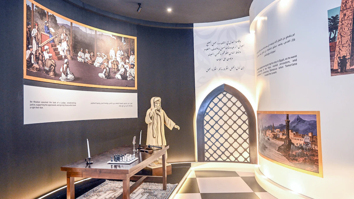 وأوضح المهندس رامز صقر المتحدّث باسم جناح "ابن خلدون"، أن الجناح الضخم "مصمّم على شكل ثلاث غرف تمثّل ثلاث حقب زمنية من حياة "ابن خلدون"، الذي يعدّ أحد أهم العقول التي أنجبتها الحضارة العربية الإسلامية، وارتبط اسمه بمؤلف "المقدّمة".