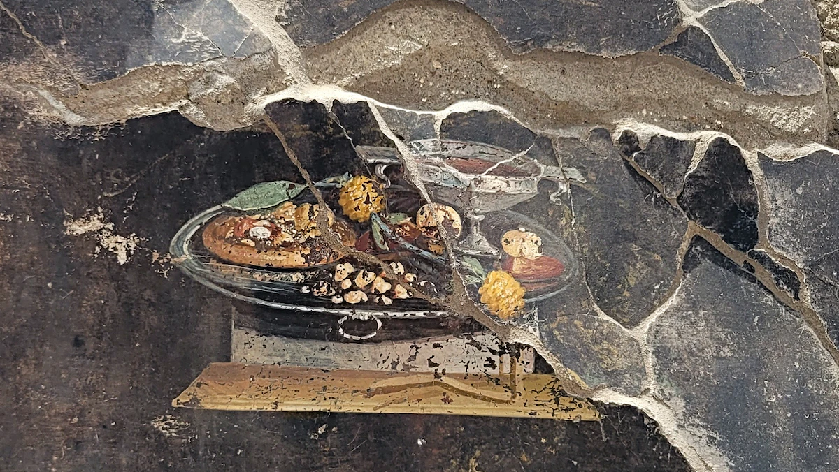 اكتشفت لوحة جدارية يعود عمرها إلى ألفي عام بين أنقاض مدينة بومبي القديمة، في إيطاليا، تصوّر وجبة فخمة من البيتزا، في وسطها بعض التوابل والبهارات، وإلى جانبها كأس من النبيذ وفاكهة الأناناس.