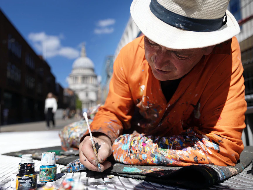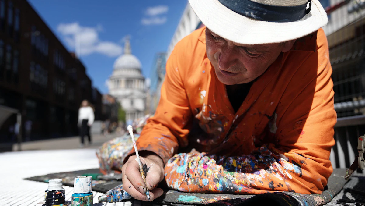 يستلقي الفنان بن ويلسون على جانبه على جسر ميلينيوم الشهير في لندن، بينما يرسم على قطعة من العلكة الجافة ملتصقة بالأرض.