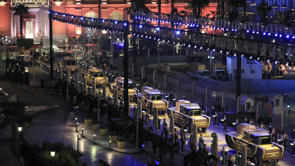 شهدت شوارع العاصمة المصرية القاهرة، مساء السبت، رحلة "الموكب الملكي" غير المسبوقة، لنقل مومياوات 18 ملكاً و4 ملكات من عصر الدولة القديمة، بينها رمسيس الثاني، والثالث، وحتشبسوت، وسقنن رع، وتحتمس الثالث، وسيتى الأول، وميرت آمون، وأحمس نفرتاري، من المتحف المصري بميدان التحرير، إلى المتحف القومي للحضارة المصرية بالقاهرة.
