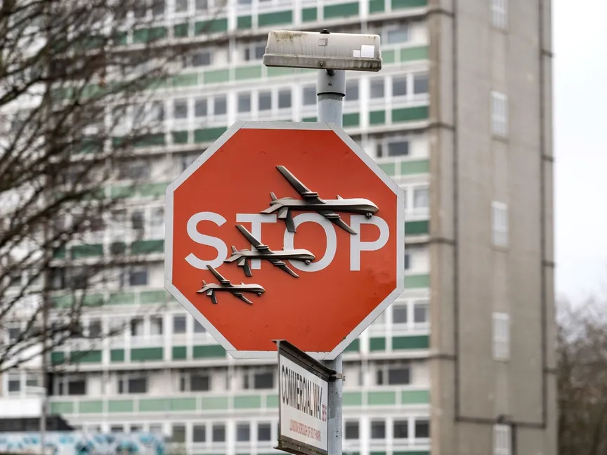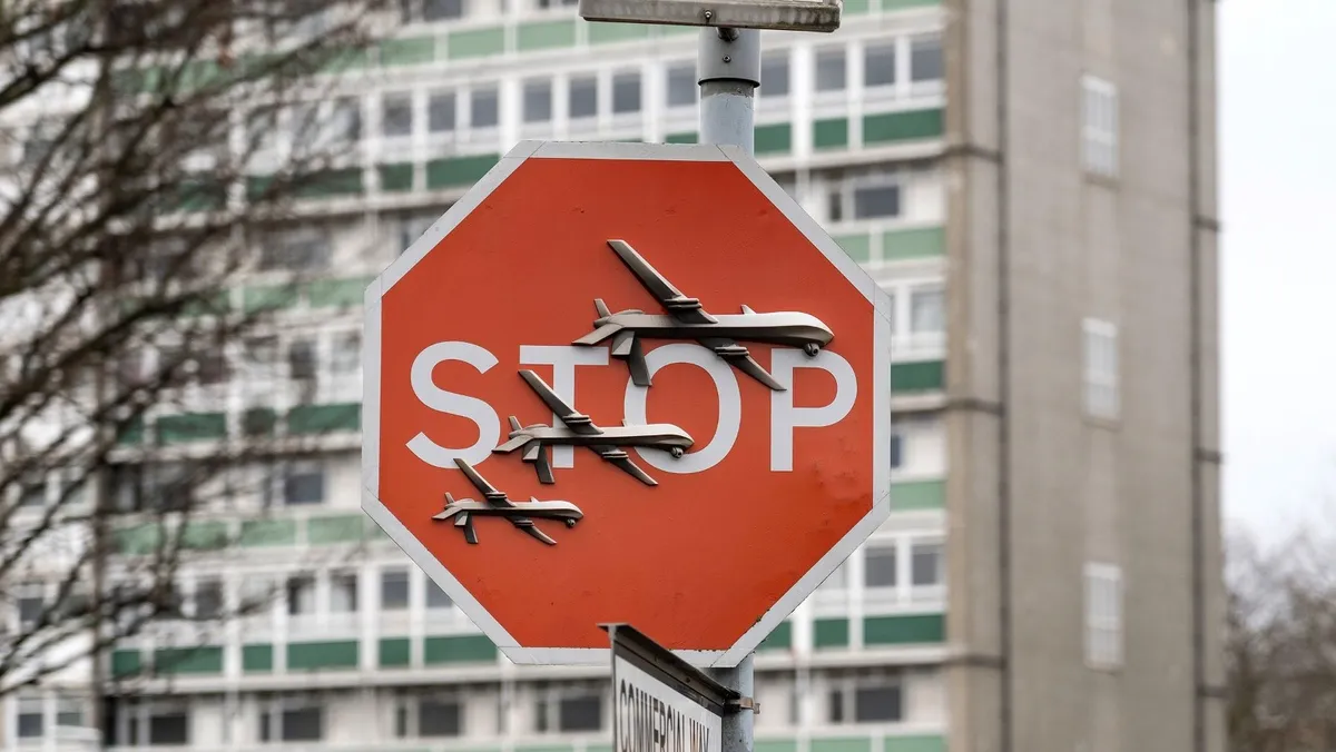 العمل الجديد لبانكسي، هو عبارة عن علامة توقّف مرورية معدنية، تضمّ ثلاث طائرات عسكرية تشبه طائرات من دون طيار، تمّ تثبيتها على لافتة وسط شارع عام في لندن.