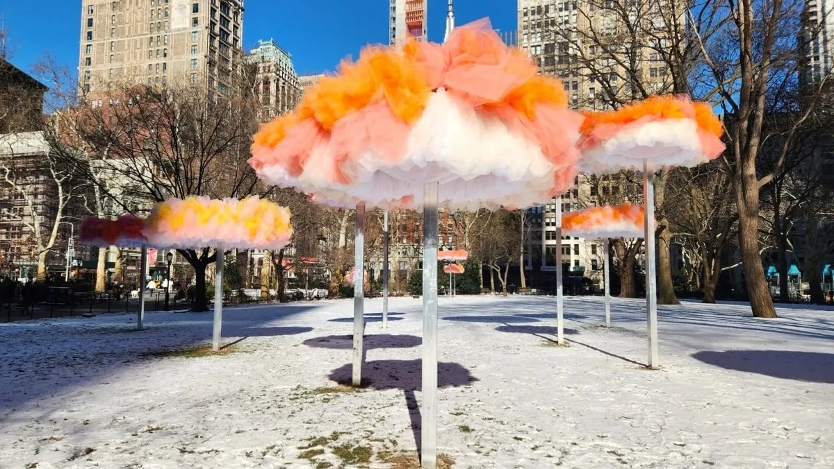 يضم المعرض ألوان "التول" الزاهية بأشكال تشبه السحب الرقيقة، وتضفي رونقاً مميزاً على شتاء نيويورك. يتألف المعرض من 15 شكلاً منسوجاً بألوان الباستيل، ضمن دوائر تتحرّك بهدوء مع النسيم البارد في الحديقة النيويوركية.