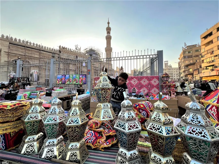 قاربت رحلتنا على الانتهاء بين ورش ومحال الفوانيس. كان في الأجواء رائحة القهوة والعطارة و"الياميش".. الوجوه طيّبة تغمرها سكينة وشعور بالأمان. ولا أدري لماذا استوقفني "فراج" أكثر من غيره.. شاب في سن المراهقة، اختار أن يضع "البسطة" الخاصّة به بجوار سور مسجد السيدة زينب.