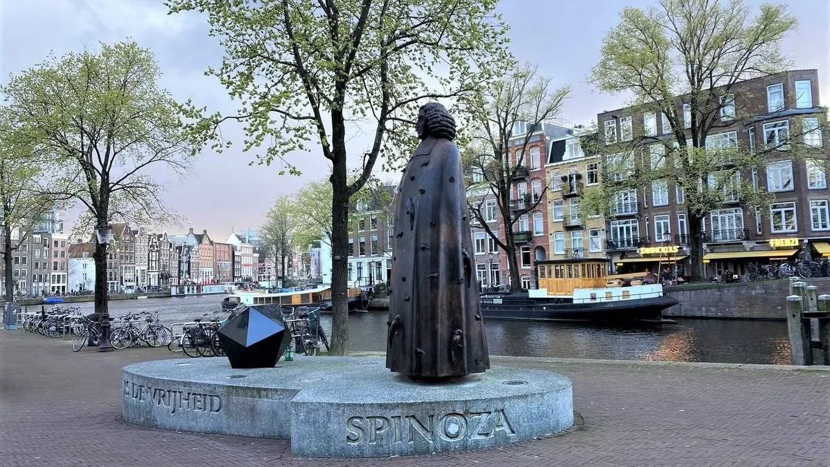 يقع تمثال سبينوزا على إحدى القنوات المائية الشهيرة في أمستردام، التي تصب في نهر "أمستل". وهكذا تتصل بالمياه جُبّته المزدانة بالطيور والورود، فضلاً عن ابتسامته وفتوة محيّاه، ما يشكّل علاقة بالخصوبة والنماء والحياة. هذه هي صفات فيلسوف السعادة كما مارسها في حياته.