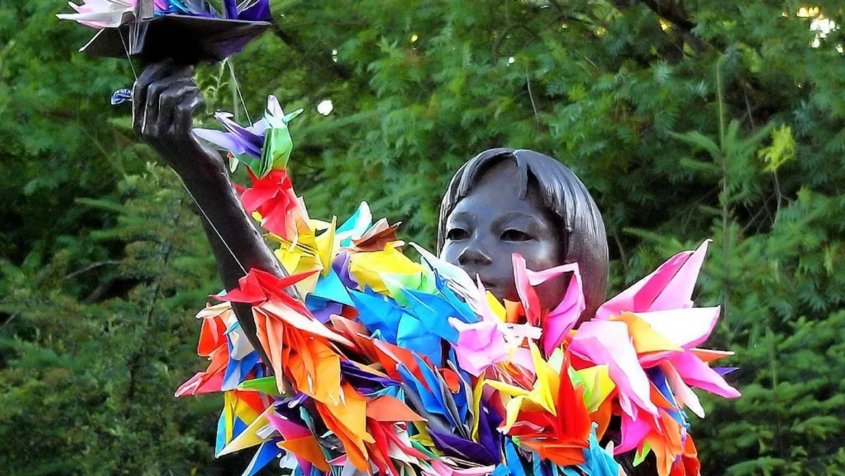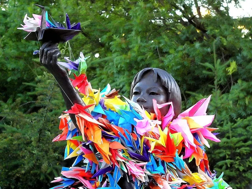 يجسّد التمثال الفتاة ساداكو ساساكي، البالغة من العمر 12 عاماً، التي توفيت بسرطان الدم الناجم عن التعرّض للإشعاع، بفعل القنبلة الذرية التي أسقطتها الولايات المتحدة على هيروشيما عام 1945.