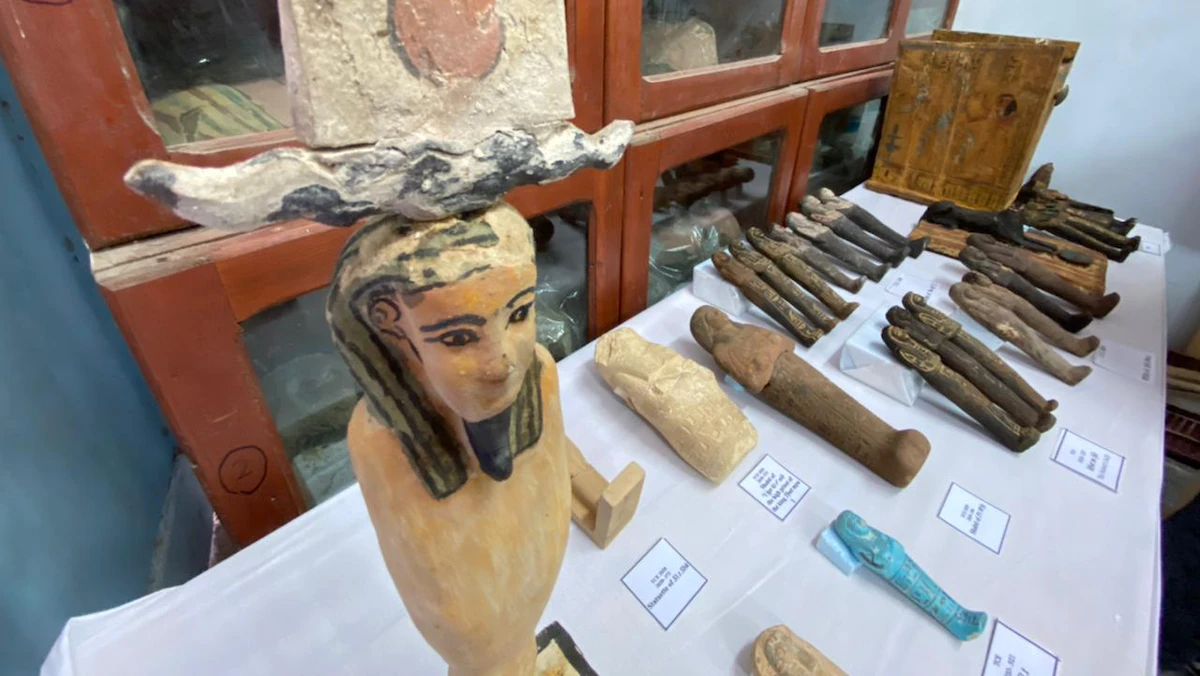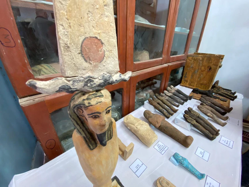 كما عثرت البعثة داخل الآبار على أعداد كبيرة من المشغولات الأثرية وتماثيل على هيئة المعبودات، فضلاً عن تماثيل أوشابتي بحالة جيدة تنتمي لعصر الدولة الحديثة.