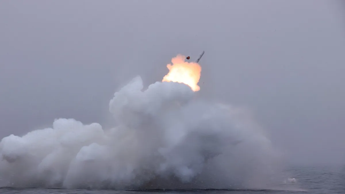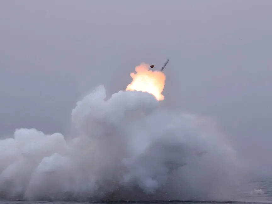 منظر لما يبدو أنه اختبار صاروخ كروز أطلق من غواصة في مكان غير معلوم في كوريا الشمالية في هذه الصورة التي نشرتها وكالة الأنباء المركزية الكورية . 28 يناير 2024 - REUTERS