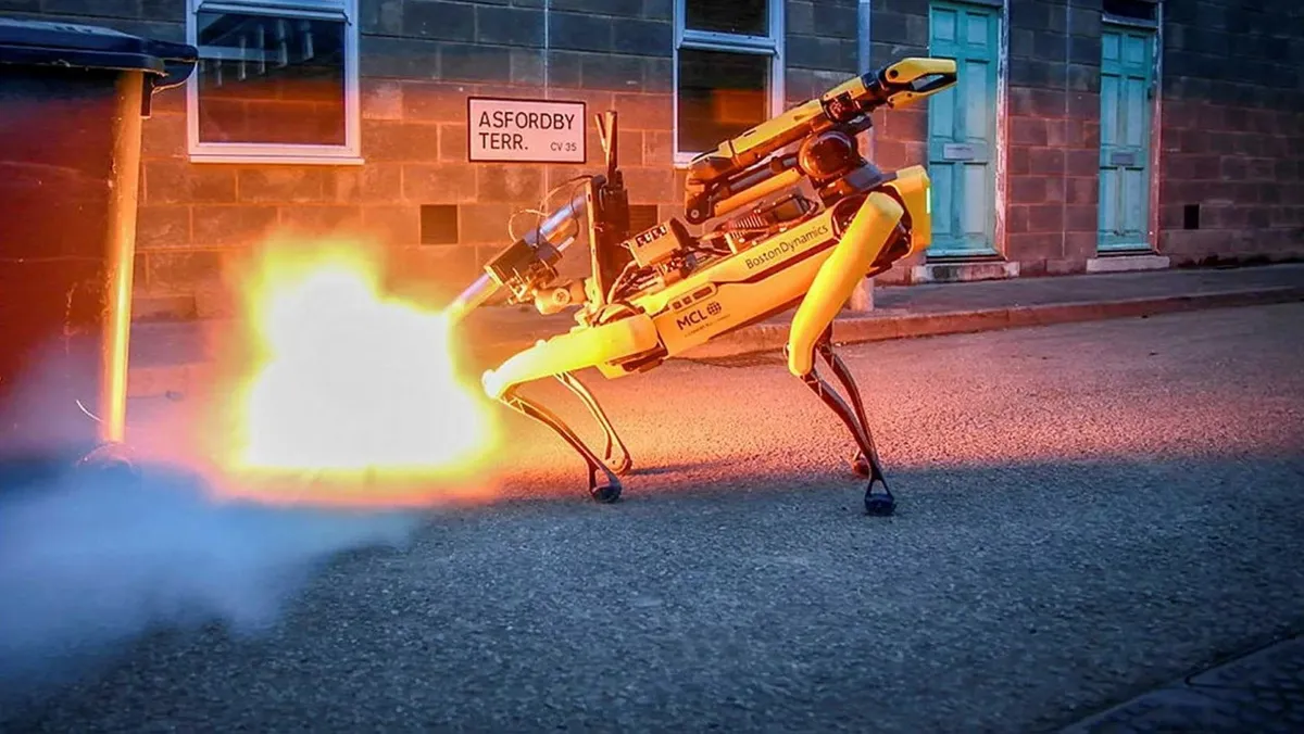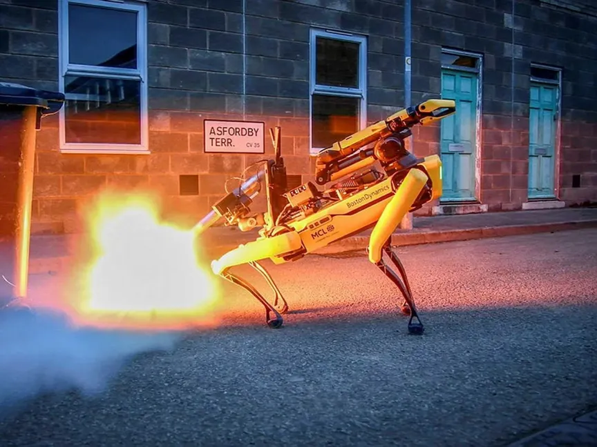 وكان من أبرز ما تم إنجازه في هذه التجارب استخدام الكلب الآلي Spot من إنتاج شركة Boston Dynamics، والذي تم دمجه مع جهاز تفكيك الحرائق الكربوني، وهو أداة متخصصة مصممة لتحييد التهديدات المتفجرة على مسافة آمنة.