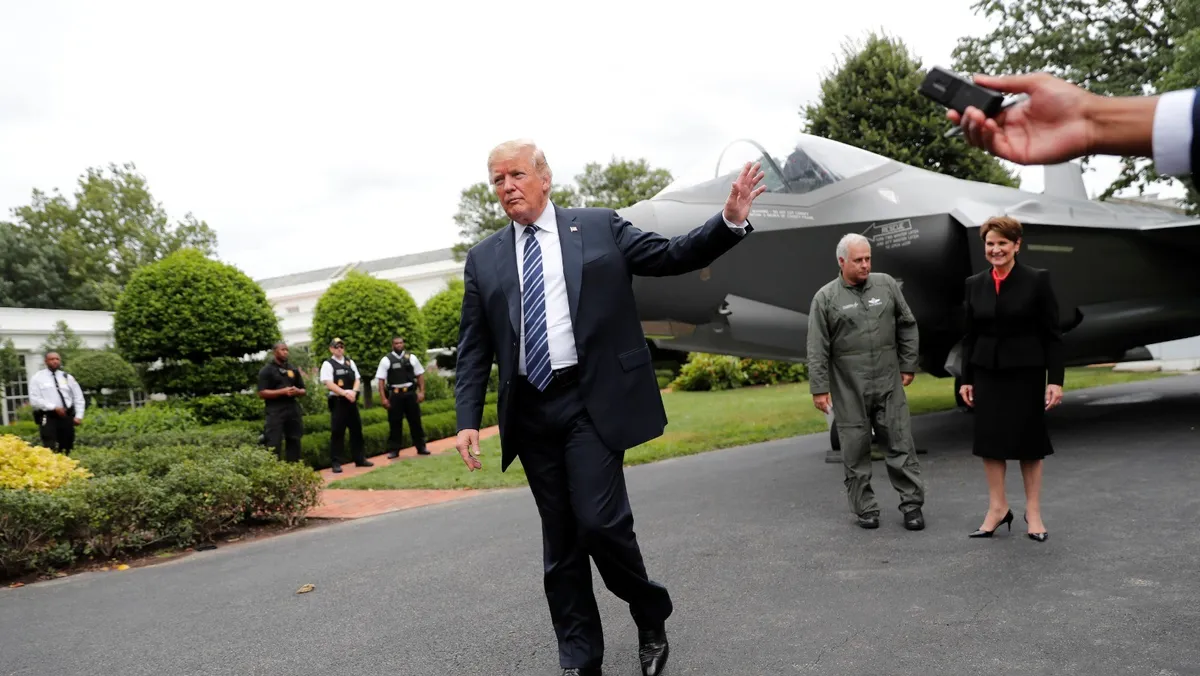 الرئيس الأميركي دونالد ترمب أمام مقاتلة F-35 الشبحية في ساحة البيت الأبيض. واشنطن. 23 يوليو 2018 - Reuters