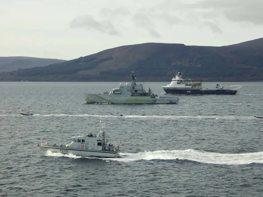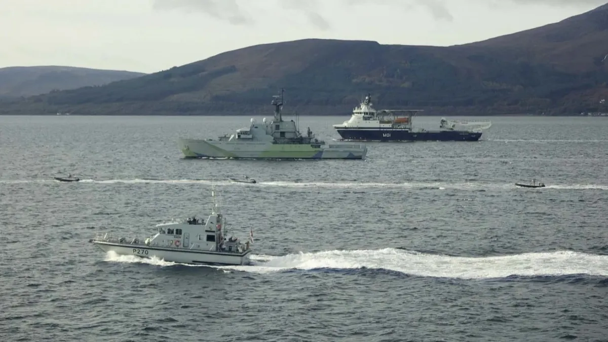 وأوضحت البحرية الملكية أن "العرض شهد تعاون السفن مع الغواصة P2000 HMS Biter من سرب القوات الساحلية، وطائرة مروحية Merlin، وسفن الدوريات HMS Tyne وسفن HMS Stirling Castle في تمرين لإثبات المفهوم".
