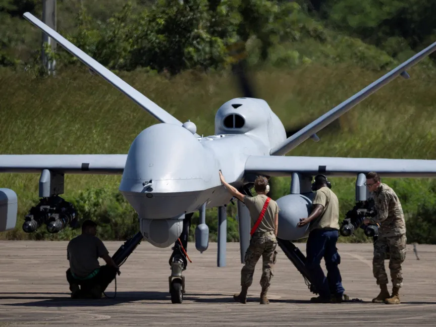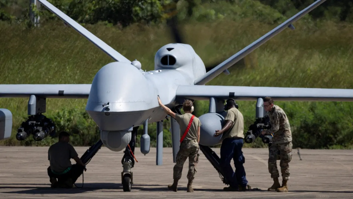 فحص  طائرة مسيرة من طراز MQ-9 Reaper تابعة للقوات الجوية الأميركية في مطار رافائيل هيرنانديز في بورتوريكو. 17 نوفمبر 2025 - Reuters