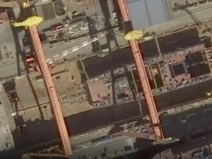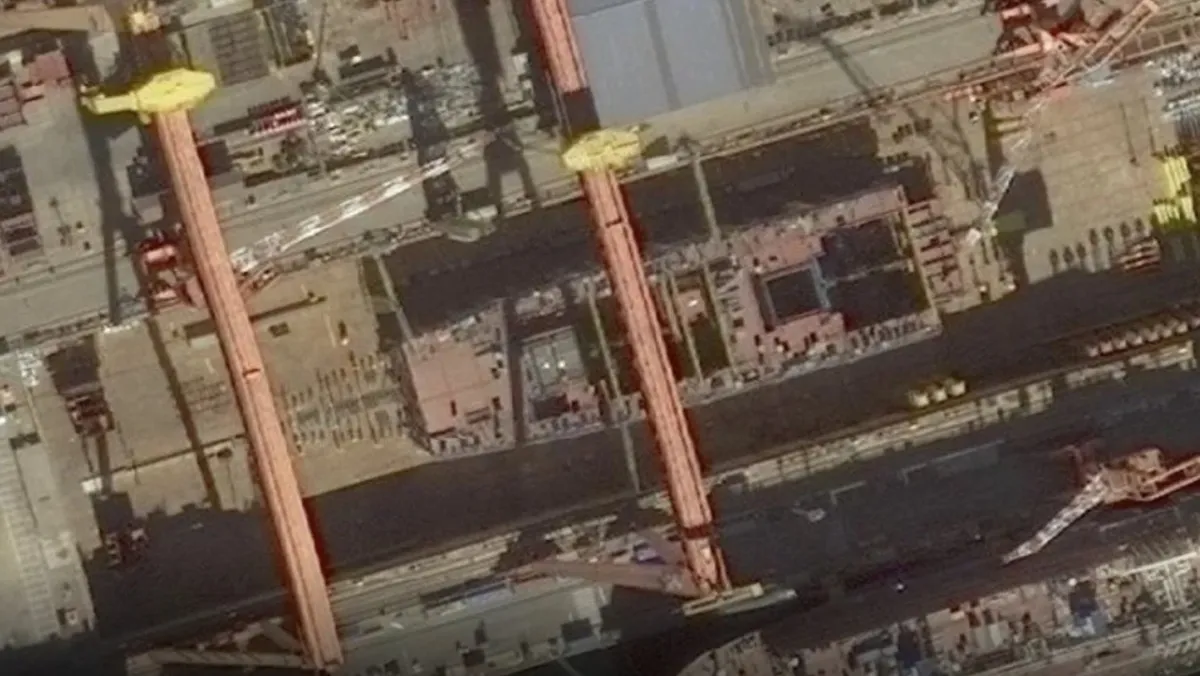 ومنذ فبراير، لاحظ المحللون تركيب كتل العارضة، وهي دعامات خشبية ضخمة تُستخدم أثناء بناء السفن، والتي تمتد لأكثر من 270 متراً، مما يشير إلى الاستعدادات لبناء سفينة بحجم حاملة طائرات.