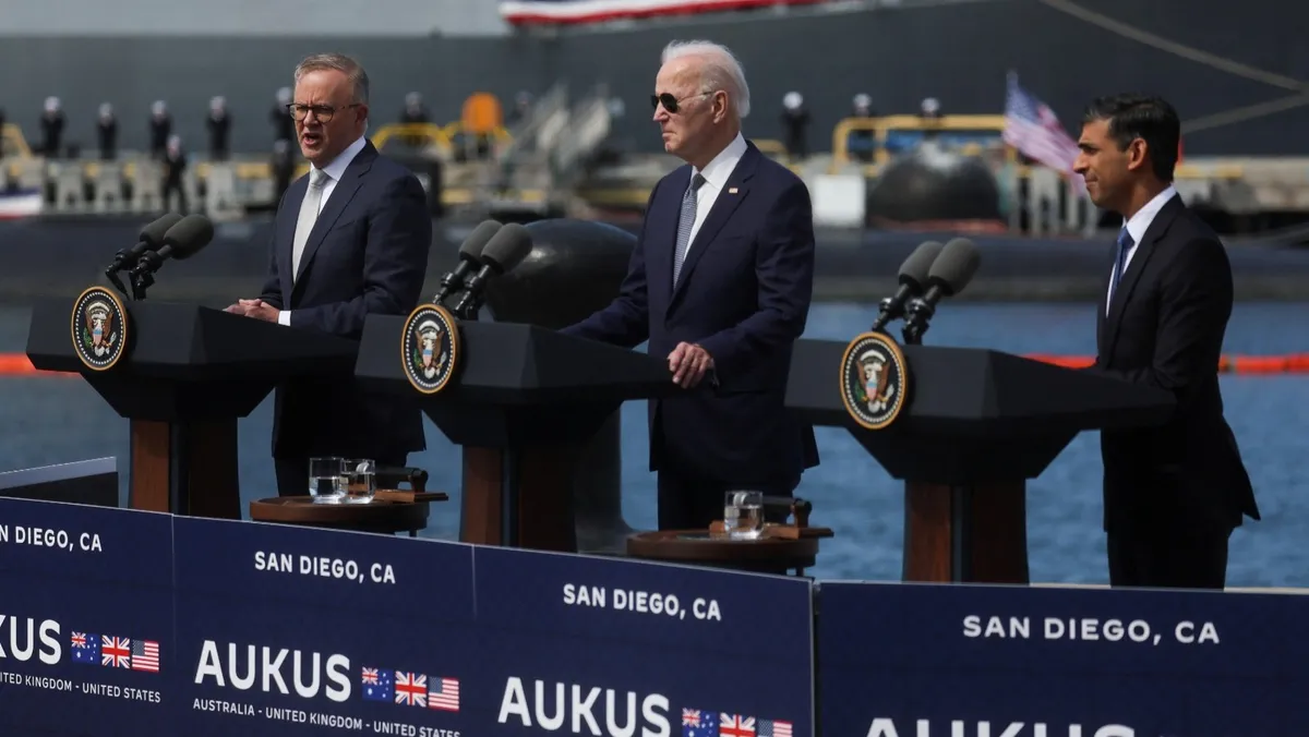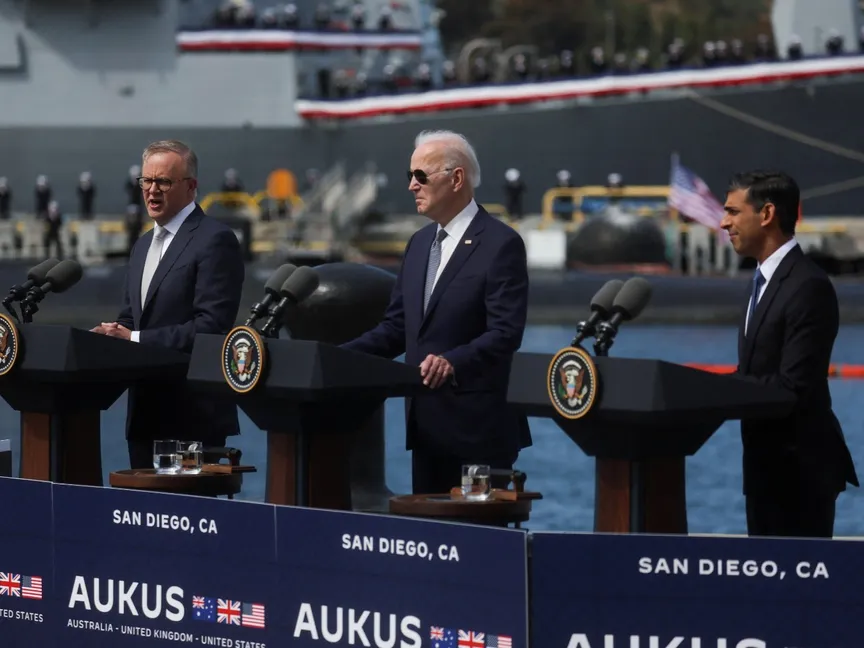 مؤتمر صحافي لزعماء الولايات المتحدة وبريطانيا وأستراليا عقب اجتماع بشأن تحالف "أوكوس" في قاعدة "لوما" البحرية بسان دييو في ولاية كاليفورنيا. 13 مارس 2023 - Reuters